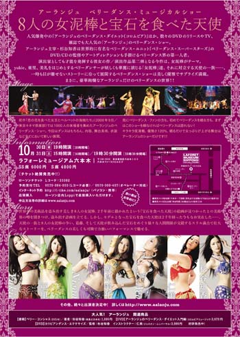 10月のアーランジュのベリーダンス・ショーの会場は、不思議な一体感を出せる空間にしよう!と、大まかに言うとそんな打ち合せ。ベリーダンスは、ホールのような大きなステージで演じられる場合もあるし、こぢんまりとした小さなレストランで踊られる場合もある。その両方の良い部分を出せたら良いね〜〜と話しました!女泥棒役の8人も決定し、飛び道具的なサプライズのベリーダンサーも登場します。これがまた迫力があってかなり凄い!ジプシーやエジプシャン、シアターやフュージョンなど様々なスタイルのベリーダンスが観られる唯一の舞台となる予定ですので、皆さんぜひお楽しみに〜。