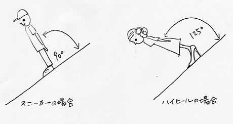 重力の関係で上図のように前かがみになり、それを修正して倒れないように歩くため、ハイヒールの靴をはいてる女子はそれ以外の人より下り坂道を歩く時すごく体力が必要なのです。そのへんを(特に)男性にはわかってもらえなくて転びそうになる事がよくあります。
